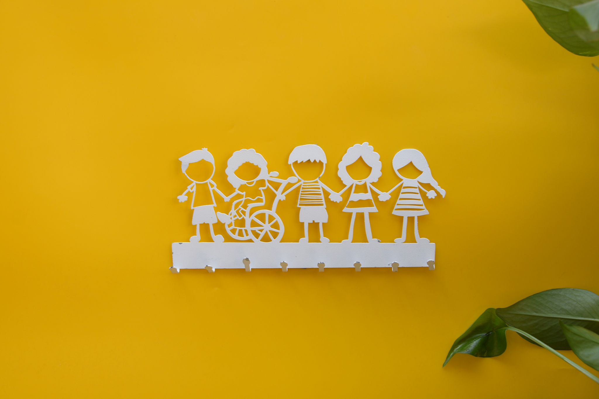 זהו מתקן תלייה מעוצב ממתכת בצבע לבן, בצורת דמויות ילדים מחזיקים ידיים, כולל דמות של ילד בכיסא גלגלים – מסר של שוויון ושילוב. בתחתית יש ווים קטנים שמתאימים לתליית מפתחות, תיקים או אביזרים קלים. המוצר משלב שימושיות עם עיצוב חם ומשפחתי, ומתאים לבית, לחדר ילדים או כמתנה מיוחדת.
